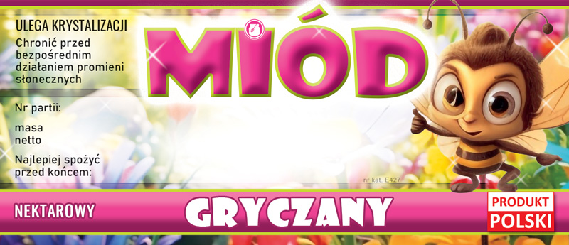 Etykieta z serii "z pszczółką" o wzorze E427 w różowych odcieniach dedykowana jest na miód gryczany. Wizerunek uśmiechniętej pszczółki na pewno przyciągnie uwagę - zwłaszcza rodzin z dziećmi.