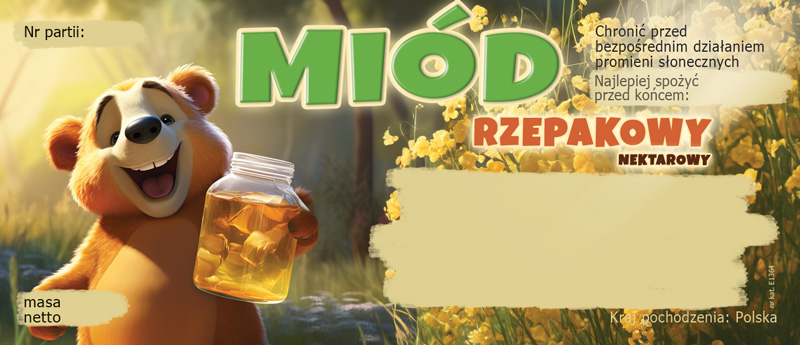 Samoprzylepna etykieta o wymiarach 116x50 mm stworzona z myślą o miodzie rzepakowym. Wzór E1364 przedstawia uśmiechniętego misia, trzymającego słoik z miodem - na pewno wzbudzi pozytywne emocje, zwłaszcza wśród klientów z dziećmi.