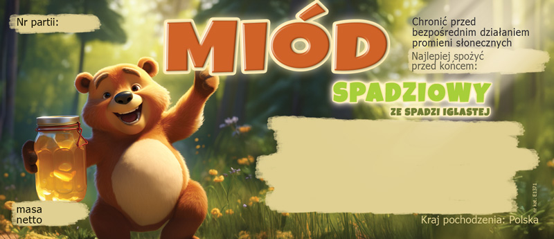 Samoprzylepna etykieta o wymiarach 116x50 mm stworzona z myślą o miodzie spadziowym ze spadzi iglastej. Wzór E1371 przedstawia radosnego misia, trzymającego słoik z miodem - na pewno wzbudzi pozytywne emocje, zwłaszcza wśród klientów z dziećmi.