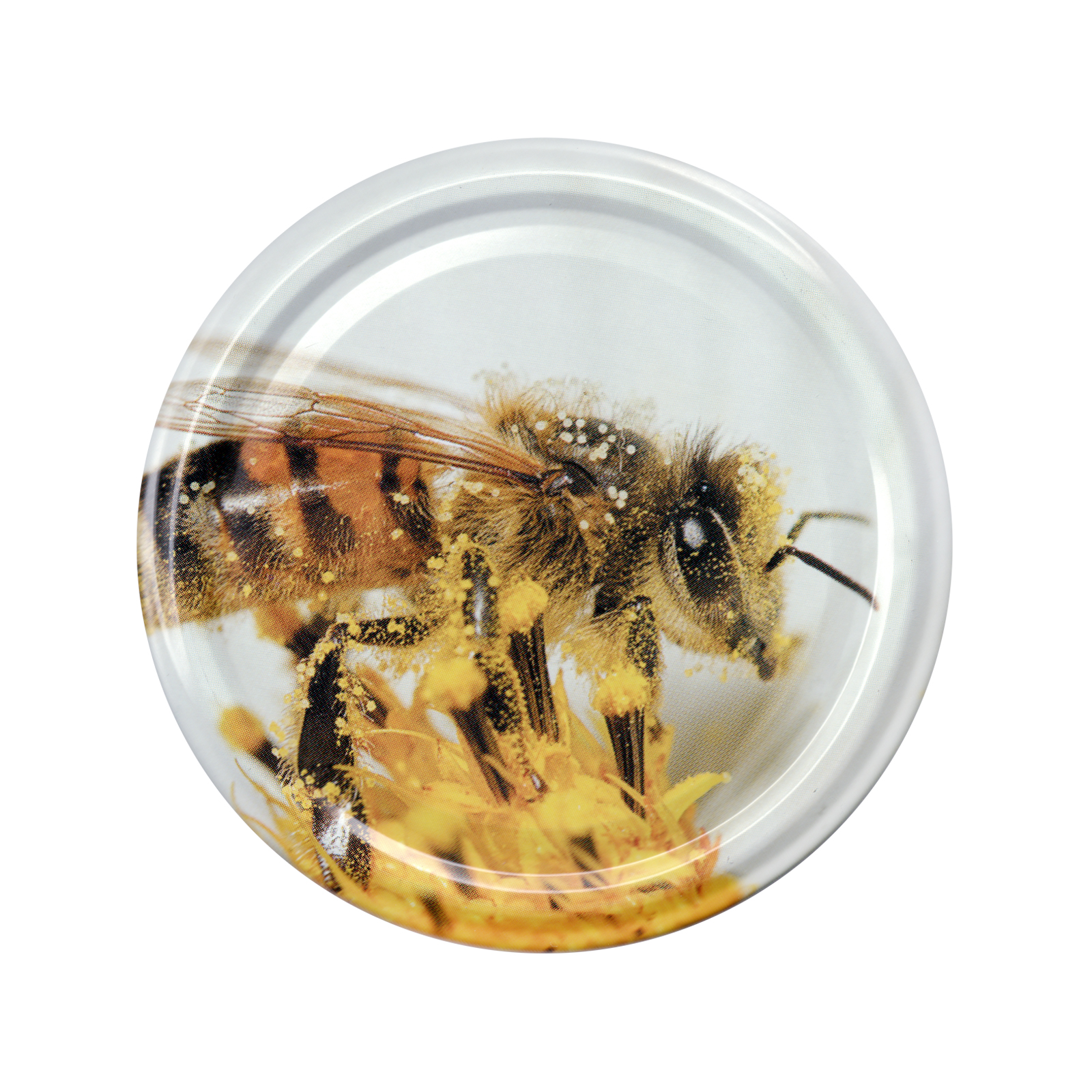 Paczka DUŻYCH nakrętek na słoiki z miodem (50szt) BIAŁE Z PSZCZOŁĄ - wzór ND84