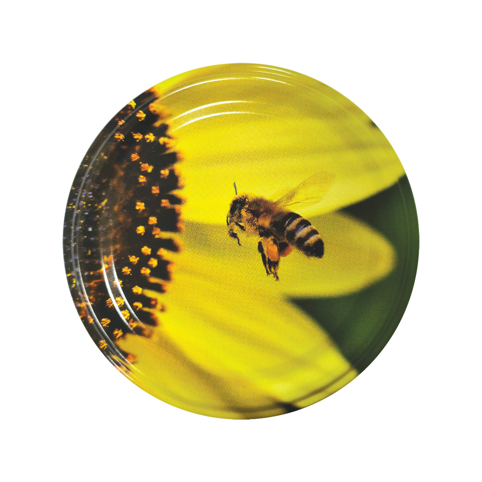 Nakrętki w żółtej tonacji, przedstawiające pszczołę lecącą do kwiatka.