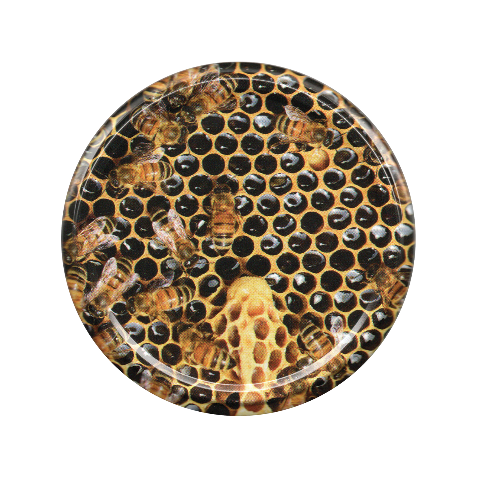 Paczka DUŻYCH nakrętek na słoiki z miodem (50szt) CIEMNE, PSZCZOŁY NA PLASTRZE - wzór ND98